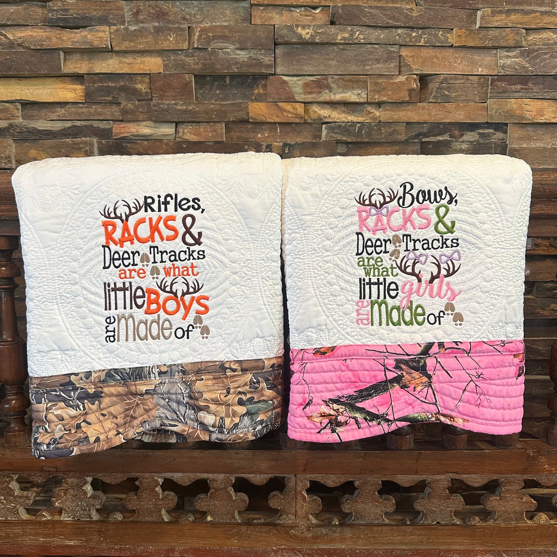 Wrap your little one in rustic charm with this handcrafted camo border quilt. Featuring detailed embroidery that reads “Rifles, Racks & Tracks Are What Little Boys/Girls Are Made Of”, this quilt blends outdoor spirit with cozy comfort. The camo border adds a rugged, adventurous touch, while the soft quilted design makes it perfect for snuggling, nursery décor, or a thoughtful gift for hunting and outdoor-loving families.