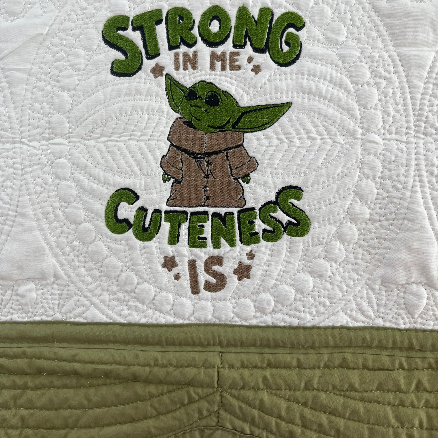 This cozy quilt is a must-have for Star Wars fans of all ages, from Padawans to seasoned Jedi Masters. Featuring an embroidered image of Grogu (affectionately known as “Baby Yoda”) at the center, it’s framed with an olive green border that evokes the calm strength of the Jedi. Below Grogu, whimsical embroidered text reads: “Strong in me cuteness is” – a playful nod to Yoda-speak and Grogu’s irresistible charm. Whether you’re snuggling up for a Star Wars marathon or decorating a galaxy-themed nursery, this quilt brings warmth, humor, and a little bit of the Force to your universe.